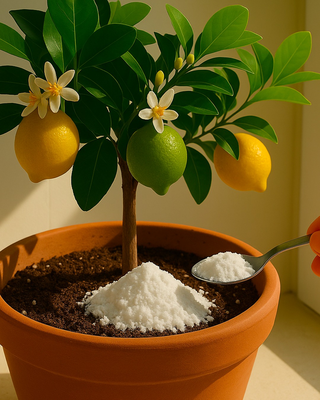 Trapianto: sistema la pianta nel nuovo vaso e riempi con terriccio fresco specifico per agrumi (pH tra 6 e 6,5).